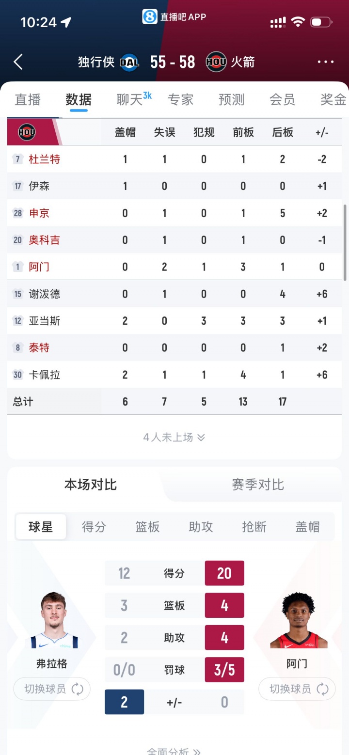 火箭上半场58-55领先独行侠3分!阿门20+4+4!谢泼德被军训