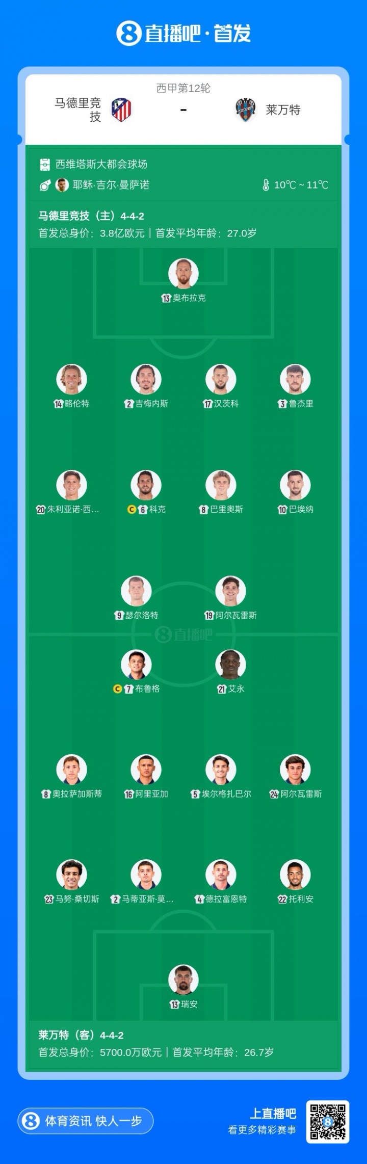 马竞目前6胜4平负,暂以22分排名第四,落后榜首8分。莱万特2胜3平6负,暂以9分排名第17。