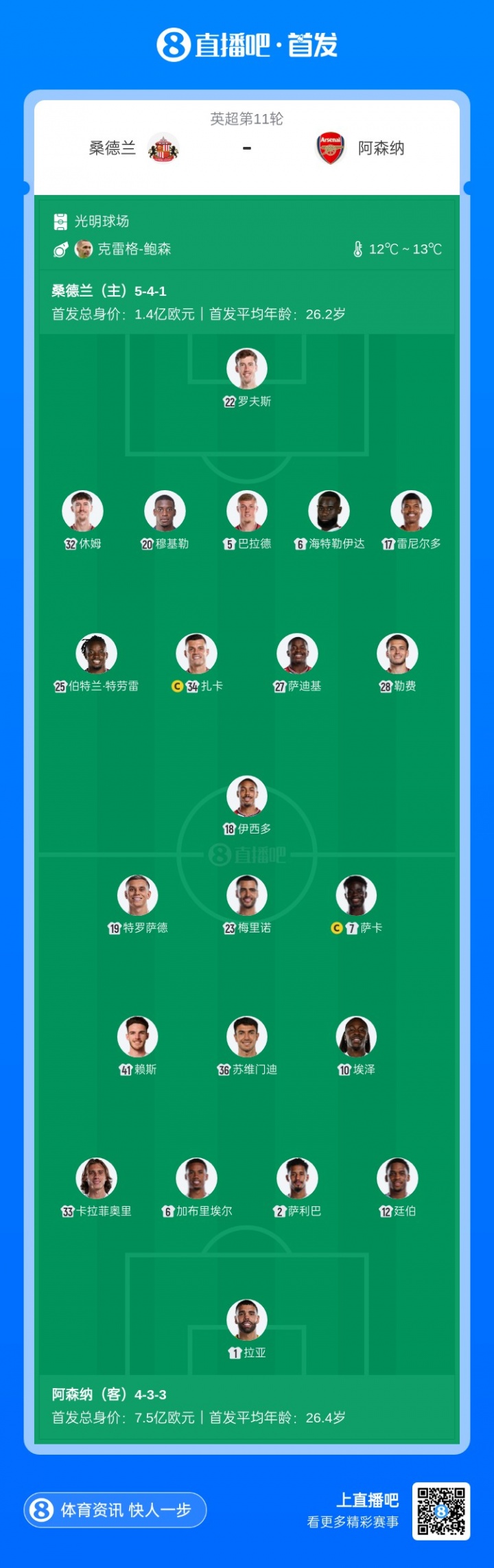 阿森纳首发:1-拉亚、2-萨利巴、6-加布里埃尔、12-廷伯、33-卡拉菲奥里、10-埃泽、23-梅里诺、36-苏维门迪、41-赖斯、7-萨卡、19-特罗萨德