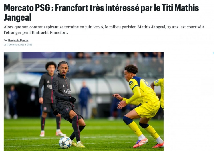 12月19日讯 据《巴黎人报》报道,法兰克福以及英超球队均有意巴黎圣日耳曼17岁小将扬吉尔(Mathis Jangeal)。除了恩贾恩图外,扬吉尔是本赛季恩里克提拔的另外一名青训营小将。