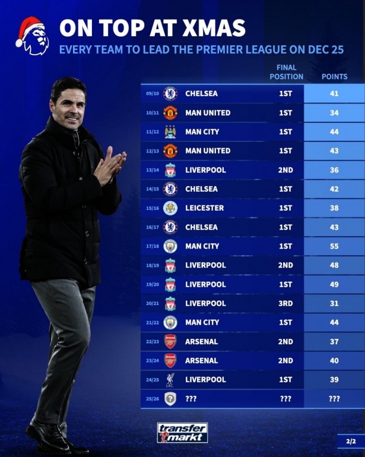 12月19日讯 《转会市场》列出了近年英超圣诞榜首球队的积分及最终排名,近7年仅3队最终夺冠。